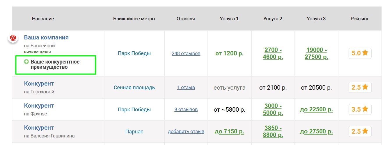 Если низкие цены — ваше конкурентное преимущество, их можно выделить. Размещение цен ниже определённого лимита является платным: чем ниже цена, тем дороже размещение. Стоимость и лимит зависят от конкретной услуги.
